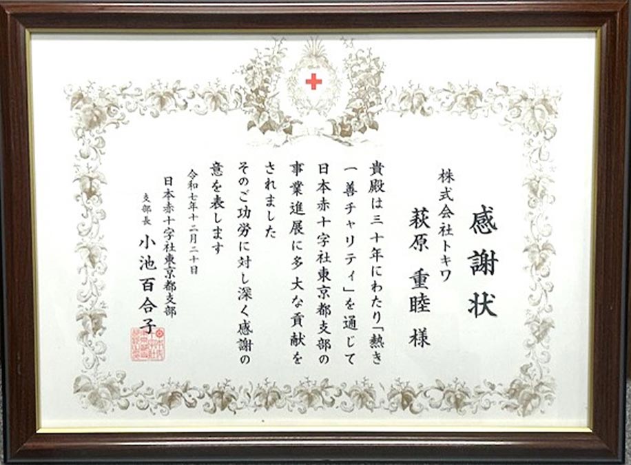 トキワの30年にわたる日赤支援活動「熱き一善チャリティ」に対し、日本赤十字社東京都支部 小池百合子支部長(都知事)より感謝状を授与致しました。